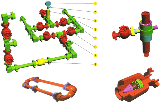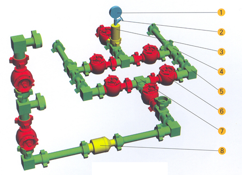 During the cause of test , fluid should be controllably guided into separator and burner after flowing through drilling rod or tubing , the assembly is named as control assembly , which can control the pressure and flow-rate of the pressure and flow-rate of the fluid safely and effectively . 1 .Control head Jointed with the upper of the test string . Control head is classified into rotary head and un -rotary head of two kinds , and also into three kinds of 35MPa , 70MPa and 105MPa according to the bearing pressure , and it can let the high -pressure fluid flow out of string , but also pump fluid into well . 2 .Rigid manifold Used to control fluid pressure and flow-rate . Rigid manifold is joined with control head upwards and connected with separator and blowout pipeline downwards . The working pressure includes 35MPa , 70MPa and 105MPa with appropriate test pressure of 70MPa , 105MPa and 140MPa . 3 .Active manifold Used to joint the control head , manifold and blowout pipeline , the manifold of special EUE seamless steel pipeline union and active elbow . The working pressure includes 35MPa , 70MPaand 105MPa with appropriate test pressure of 70MPa , 105Ma and 140MPA . The manifold should be regularly inspected and lubricated . Sealing ring should be replaced and sealing tested to ensure safety in test .