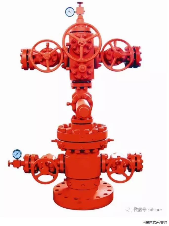 整体式是将主阀、安全阀、清蜡阀和翼阀等制成一个整体部件,阀与阀之间的距离较小,既省空间又耐高压,特别适用于海上平台的油气井。