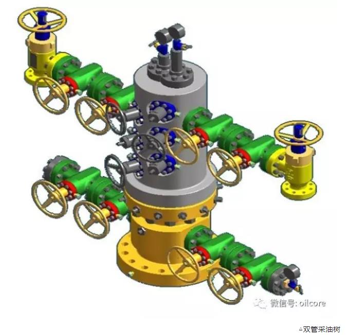 双油管采油树安装在双油管完井的井口装置上,用于两个油层同时而又独立开采的生产控制。双油管完井是在同—个生产套管中下入两根平行油管柱(长油管柱和短油管柱)或两根同心油管柱,通过双管封隔器和单管封隔器对两个油(或气)层段进行分隔。