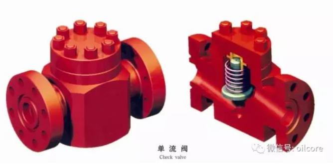 止回阀是只允许流体向一个方向自由流动的阀门,故也称单流阀。止回阀有一个自动防止流体从其他方向流动的机构。采油树上的止回阀一般安装在翼阀和油嘴之间。有的油井采油树上没有安装止回阀,但在注水井采油树上一般安装有止回阀。止回阀有出油管式、旋开式、升杆式和蝶式。止回阀可以是全开的或缩径开孔的,它的端部连接常见的有法兰式连接和卡箍式连接。