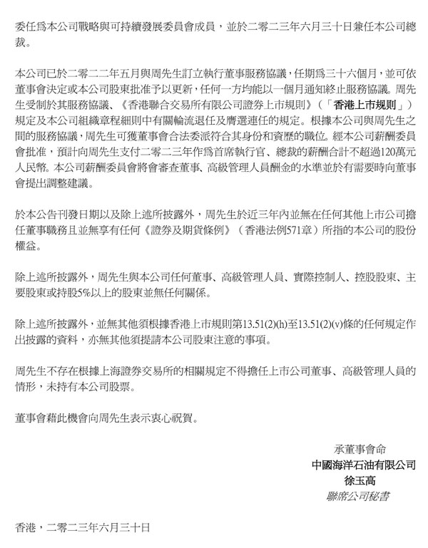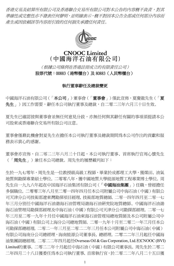 6月30日,中国海洋石油宣布,夏庆龙因工作需要,辞任公司执行董事及总裁,自今日生效。公司执行董事、首席执行官周心怀兼任公司总裁。